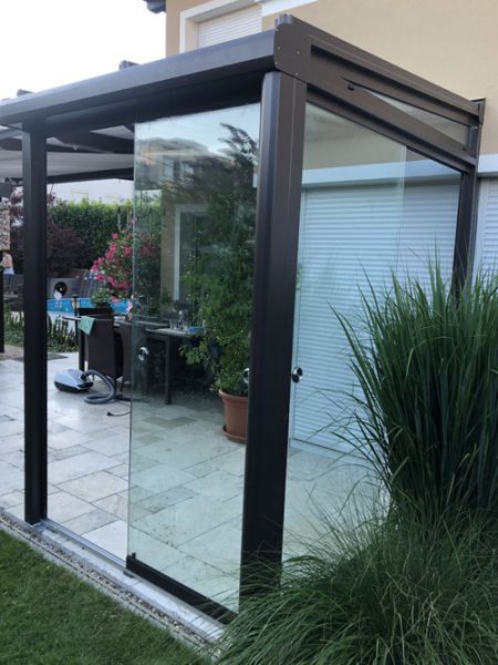 Wir durften in einem Kleingarten im 14. Bezirk einen kleinen Lounge-Bereich planen. Ein kleines Terrassendach mit einer Sonnenschutzfolie im Dachglasbereich und Nurglasschiebewände an 2 Seiten als Wind- bzw. Regenschutz wurden eingebaut! Somit ist dieser Bereich geschützt und bei jedem Wetter nutzbar! Durch die hohe Transparenz der Nurglasschiebeanlagen ist der Blick in den Garten nicht getrübt!